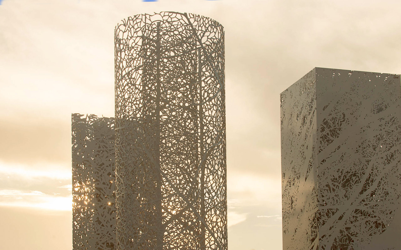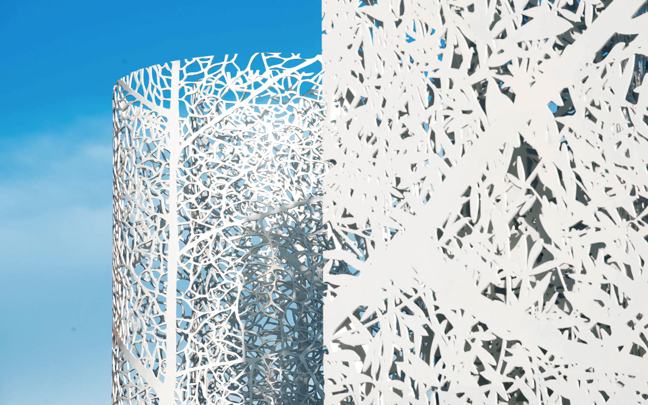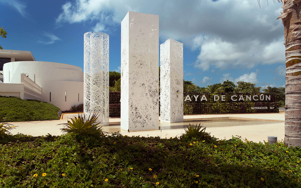At the entrance, three white ceramic-coated metal pillars by Dutch artist Jan Hedrix symbolize the natural shapes of the Mayan world.